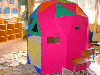 写真で紹介するのは、それをもう少し大きくして、段ボール紙で、子供の遊び場に使うドームハウスを作ってみたものです。