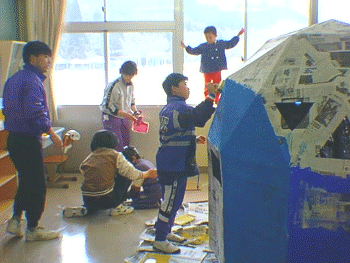 この例では外面を、新聞紙とポスターカラーで仕上げていますが、凝ったつくりにするならFRPを2層ほど塗り重ねてやればかなり強固な本格的なドームを作り上げることが出来ます。しっかりした壁を作ってやれば屋外に設置して十分小屋として利用することができます。