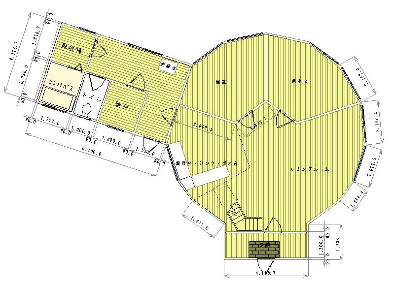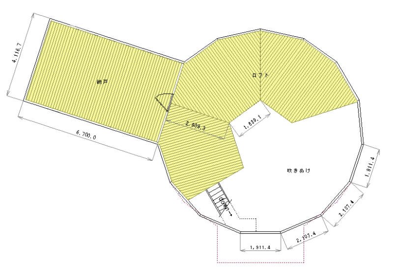 上の図は、二階(ロフト)のフロアープランです。ドーム構造の面白さを生かすためにドーム本体部分の半分ほどは吹き抜けにしています。浴室エクステンション部分のロフトは、大人が立って歩くには少し高さが低いのですが、「納戸」にしてしまうのは惜しいくらいの快適な空間です。