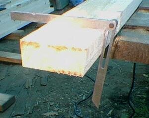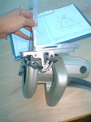自在スコヤを写真のように丸鋸に当てて、鋸刃の角度をδにセットします。