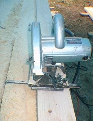 角度をセットした電動丸鋸にガイドを取り付けて部材を切断していきます。