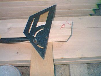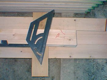 部材を切断する角度は、3角錐(台)の底角βになります。写真の黒いものは丸鋸用のガイドです。この角度をβにセットします。