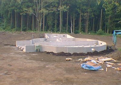 完成した基礎全景。左手が玄関、奥が浴室・トイレなどがくるエクステンション部分になる。周囲とドーム本体部分の中央に布基礎を配置し、その間は束立て。