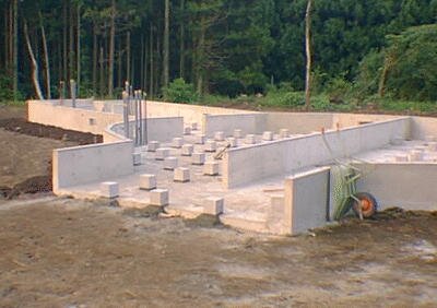 玄関部分から見た基礎。束石のピッチは900mm。玄関部分の正面方向は布基礎を作らず、ここから床下に入って、配管などのメンテナンスができるようにしてある。