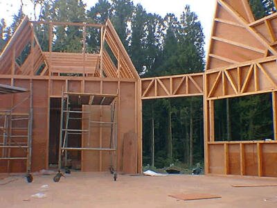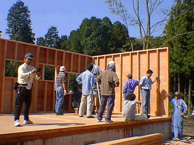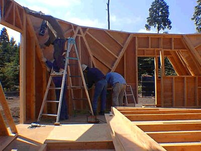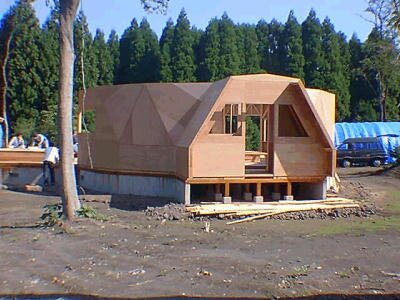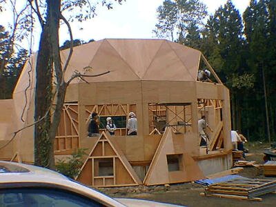 午後の作業に入って、浴室エクステンション部の屋根を施工するために、浴室エクステンション部のロフトの床張りと、ドーム本体パネルの組立ての二手に分かれて作業を進める。