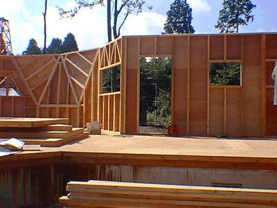 浴室エクステンション部の屋根の施工状況。第一日目の作業はこれで終了。
