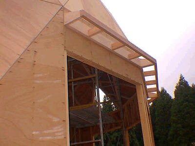 ドーム本体の垂直壁部分に水切り用の庇を取り付けた。庇より上はアスファルトシングル葺の屋根になり、庇より下の垂直壁はサイディング張りになる。
