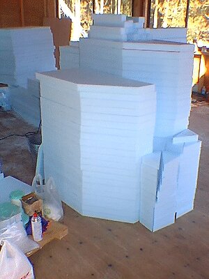 年が明けてから、作業はI氏の休日に合わせて主に週末の二日間になった。ドーム本体パネルの断熱材(スタイロフォーム)の切断作業をほぼ終え、今日から施工にかかる。