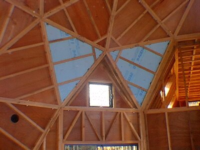 断熱材の取り付けは、ひとつのブロックを最低二つに分割して行う。ドームのパネルフレームは、外側に向かって広がっており、断熱材の寸法はフレームの内側の寸法よりも大きいので、分割しなければ収めることが出来ない。写真は、半分に分割した断熱材を収めているところ。