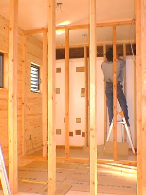 5月12日・13日の二日間でエクステンション部分の部屋割りのための隔壁のフレームを施工した。ドーム本体パネルを施工するために、エクステンション部分のロフトの床組みを先に施工したので、隔壁のフレームを納める時には、ロフトの床組みをジャッキアップして、所定の高さにして、隔壁フレームの上に高さ調整のためのすペーサーを入れて固定する。