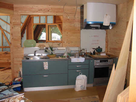 キッチンの設置状況。少し生活の匂いがしてきた。