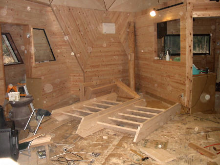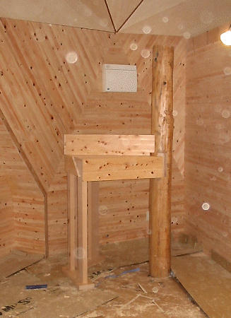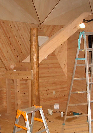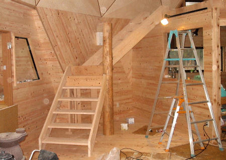 いろいろ迷いに迷った結果、階段の構造を決めました。平面形状は、中間点に1箇所126度の角度の折れ曲がりを持った構造にしました。折れ曲がり点の内側の支柱は、直径約20cmの杉丸太を使うことにしました。やっと加工が終わり、今日は階段の取り付けです。