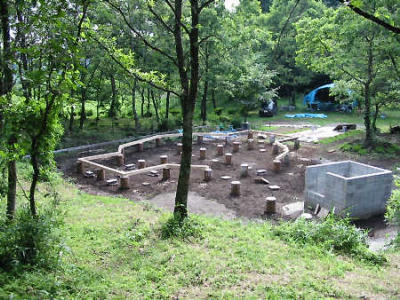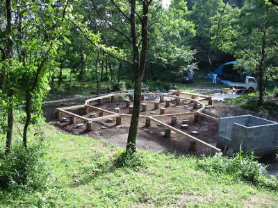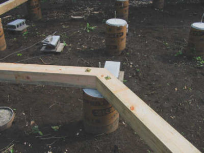 2001年7月24日から土台の施工に入りました。まず、外周の土台を配置して床の平面形状を決めます。