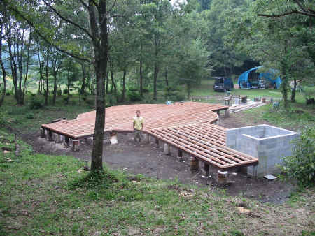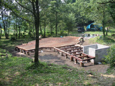 ドーム本体パネルの加工がほぼ終了したので、いよいよ現場での組立作業の準備に入ります。まず粗床を作って、そこを作業場にして立ち壁・エクステンションパネルの組立てを行います。