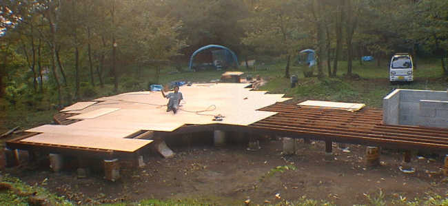 いよいよ根太の上にコンパネを張って