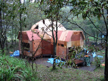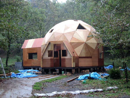 ドーム正面の玄関方向からの外観。ドーム本体部分の3角形の開口部はドーマーを取り付ける予定です。四角形の開口は天窓を取り付けます。