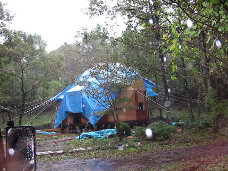 予想より早く、未明からかなりの雨が降り始めました。またしても養生が間に合わず、組み立てたばかりのドームは雨にぬれてしまいました。養生する前に全体写真をとっておきました。