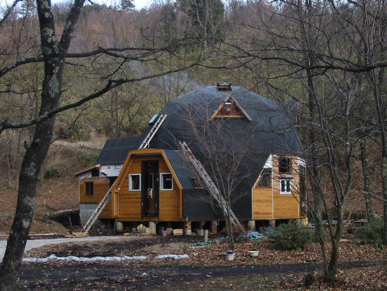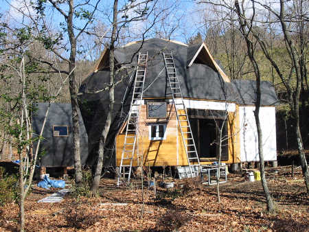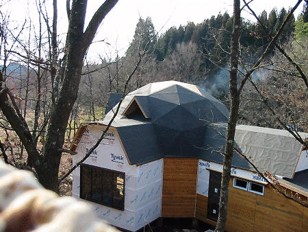 開閉式のトップライトも取り付け、ルーフィングの施工が終了した。ドーマーからは薪ストーブの煙突が出ている。だいぶ家らしくなってきました。これで今年は御用納めです。