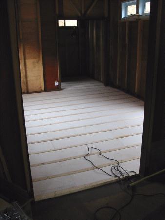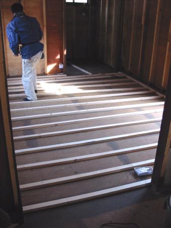 2002年1月10日:フローリングの受け材を施工します。45mm×30mmの角材を303mmピッチで配置します。