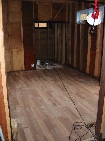 2002年1月16日:フローリングの施工状況。フローリング材は有効幅90mm、厚さ15mmの桜の無垢材です。