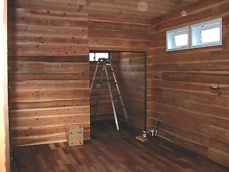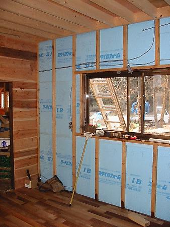 2002年2月2日:エクステンション内壁の施工状況。壁材は、杉の15mm厚の板材を相じゃくりしたものを使用しています。